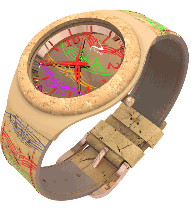 42MM DIAMETER HIGHT IMPACT HIGHT DENSITYÂ POLYCARBONATE CASE TOP RING NATURAL ITALIAN CORK SOLID STAINLESS STEEL CASEBACK WITH 4 SCREW CASE THICKNESS ONLY 8.5 MM SUPER SLIM PRECISION JAPANESE SLIM QUARTZ MOVEMENTÂ MINERAL GLASS DIAL WITH APPLIQUE INDEX SOFT MATCHING AND INTEGRATE CORK STRAPÂ WHIT INSERT 3ATM WATER RESISTANT 30 METER 100 FEET